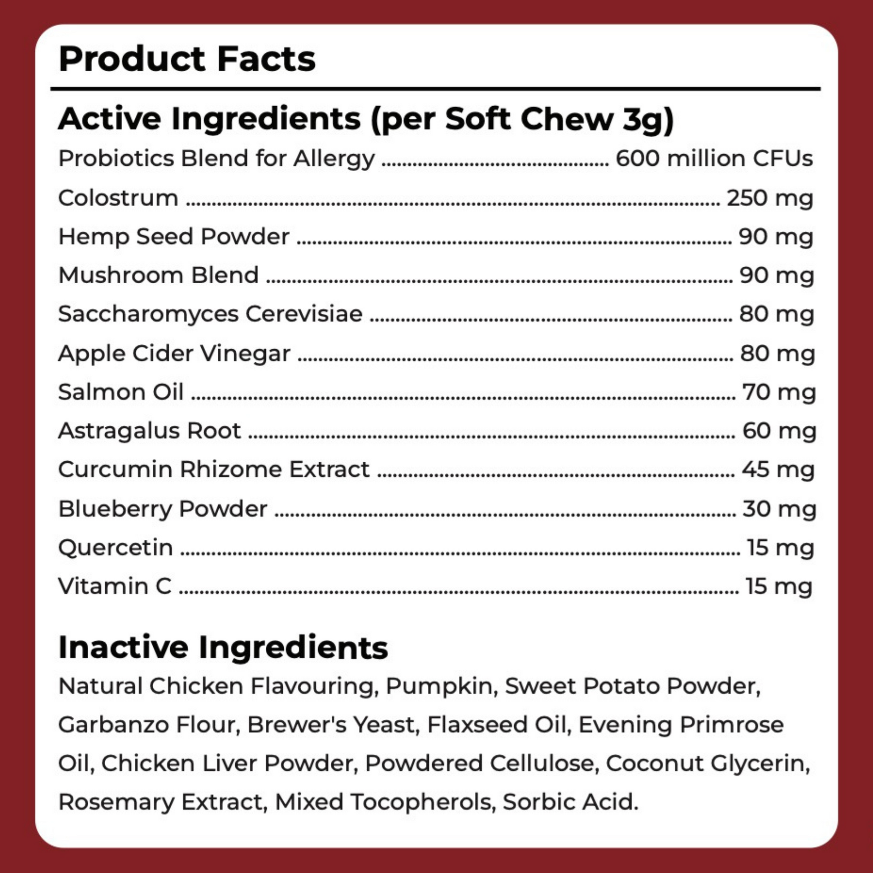 Our Happy Heroes dog immunity treats are made from a blend of natural and premium ingredients such as Colostrum, Astragalus Root and Apple Cider-Vinegar, which work together to promote immune support and gut health.