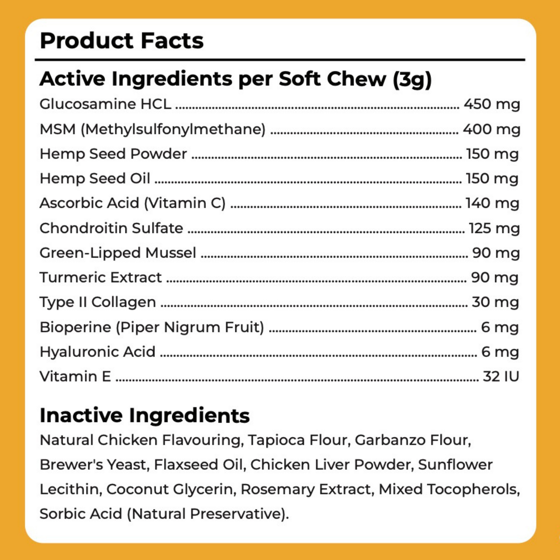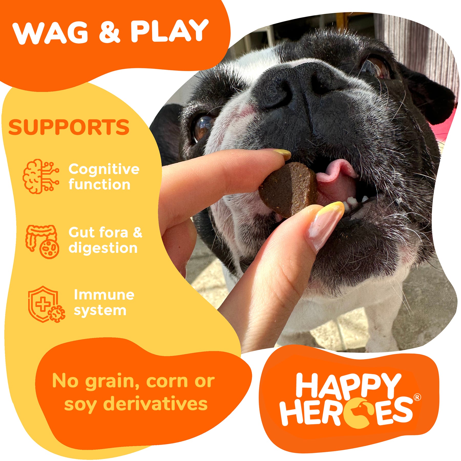 Our Happy Heroes dog mobility treats are made from a blend of natural and premium ingredients such as Vitamin E & Vitamin C, Green-Lipped Mussel, and Chondroitin Sulfate, which work together to promote a joint health, lubrication and resilience.